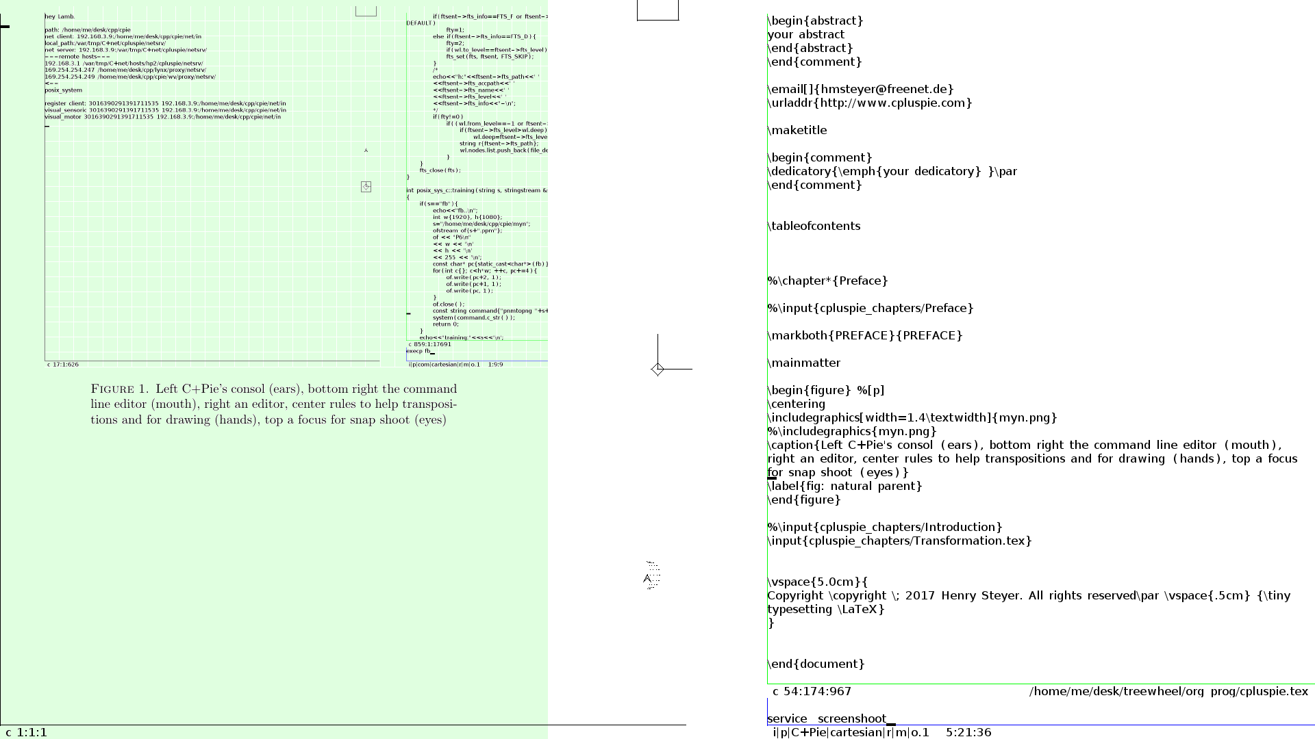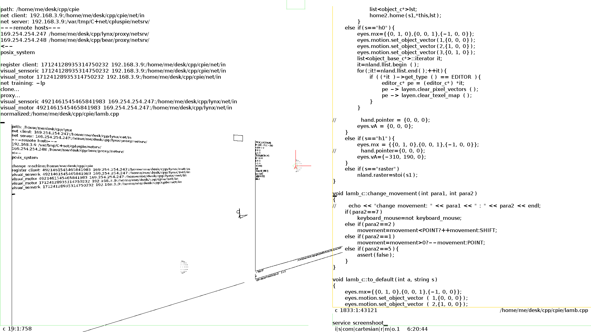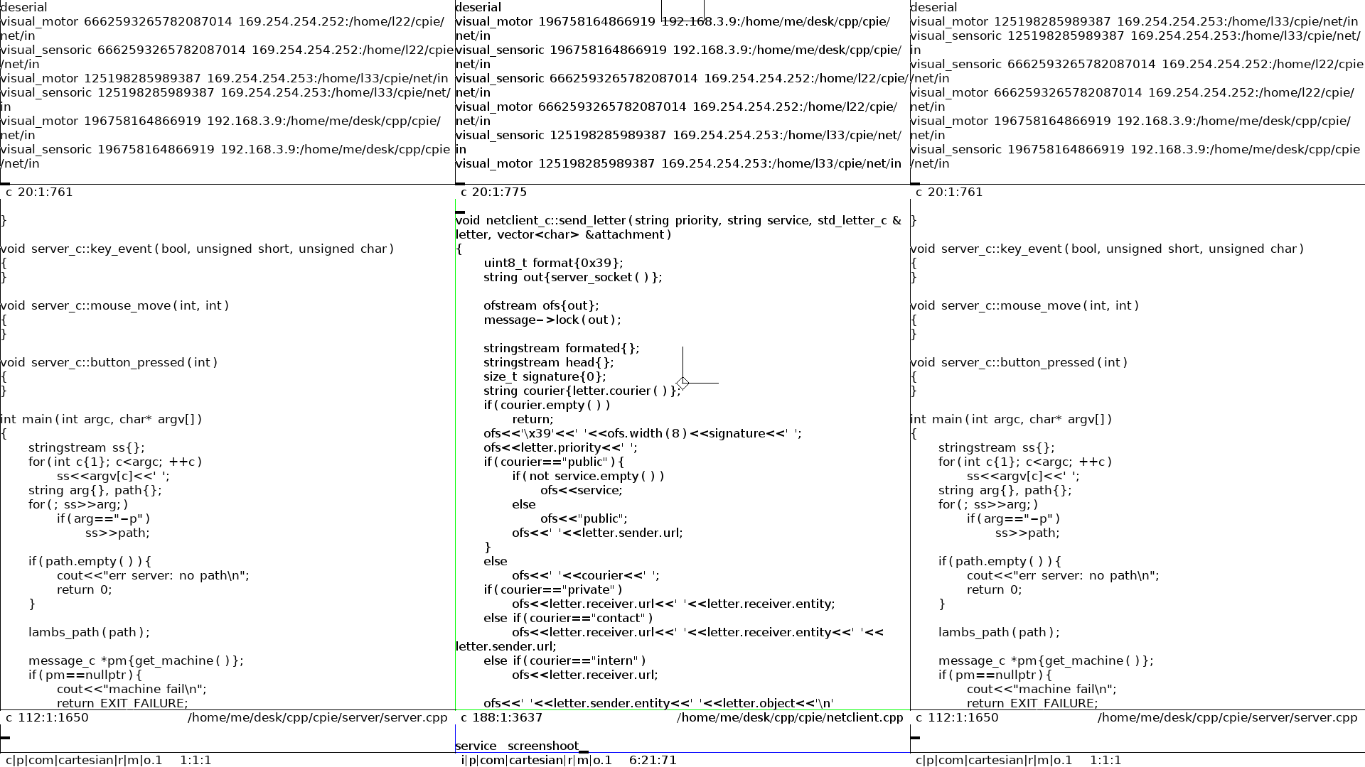 Three users have reduced the size of their desktop and the time and the place of the meeting were agreed. Every users can focus and act on a same object, the way it is done is regled by social norms. However, from the software thechnology, each object have the sole control of the information their emit and received. They can be motor, and emitting for example their graphical representation, or their can be sensory and received this information, or both. In this, the user has full control of its privacy.